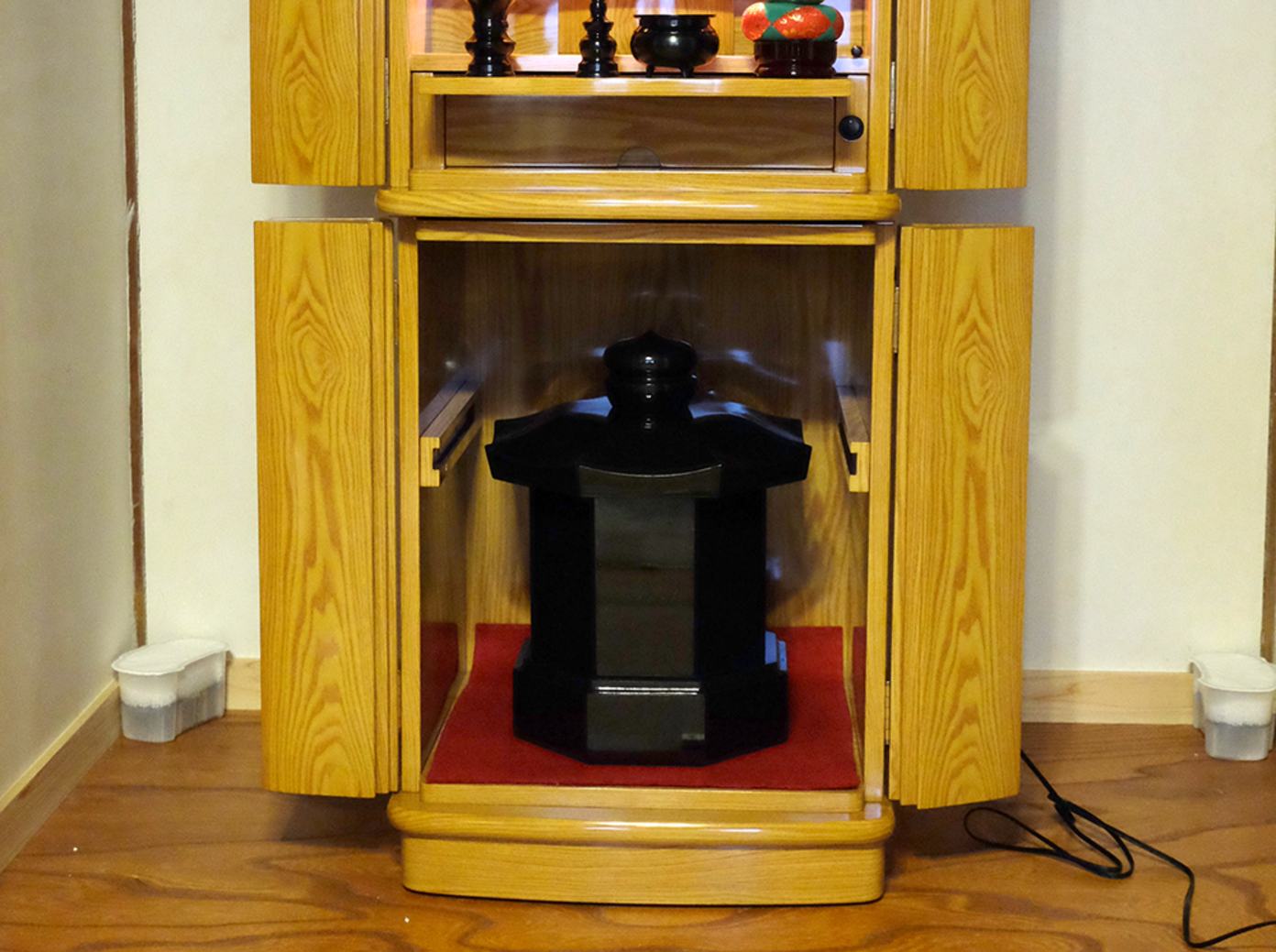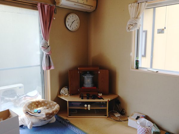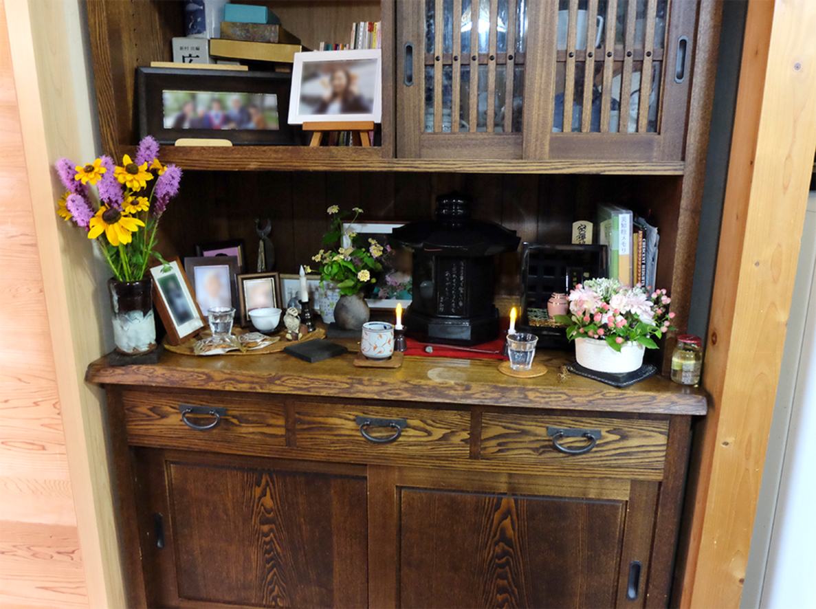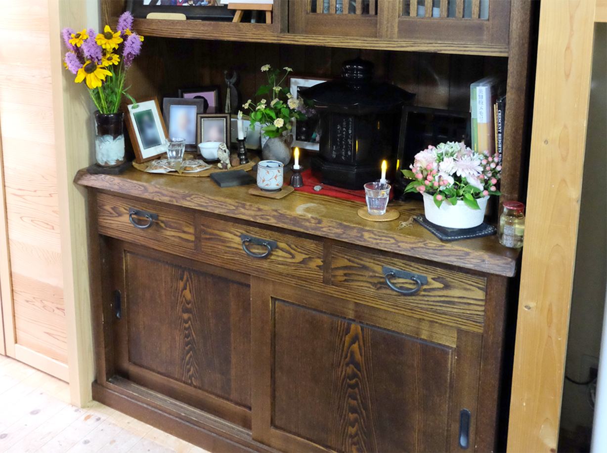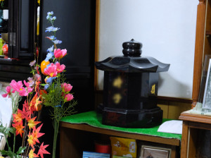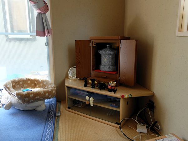 室内で可愛がっていた愛犬の、のん太君が亡くなり、自宅墓を購入し、遺骨を自宅の中に置いています。
